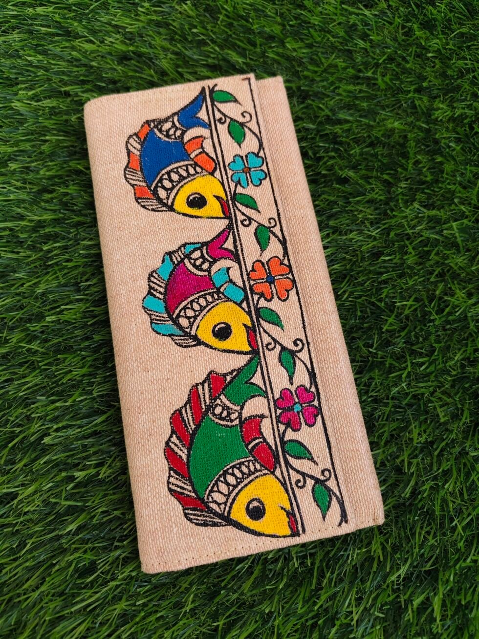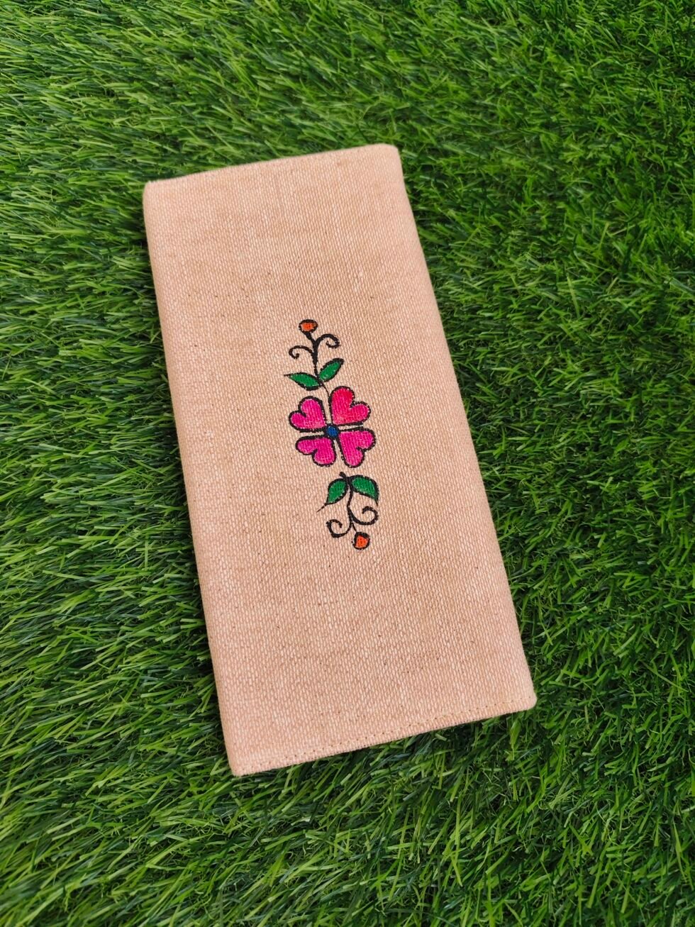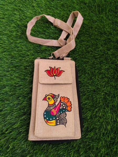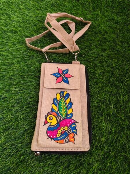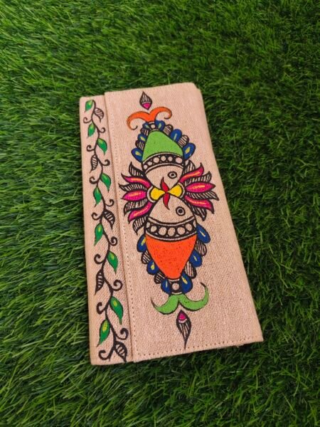 This beautifully hand-painted ladies’ clutch is a stylish way to carry your essentials. Crafted from durable jute, it features intricate Indian folk motifs brought to life through traditional hand-painted art. Perfect for adding a touch of ethnic charm to any outfit, this clutch blends elegance with cultural artistry.