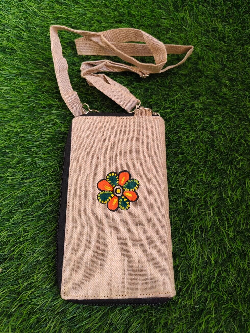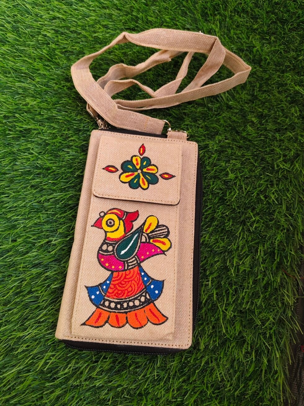 Hand-painted jute clutch cum sling with beautiful Indian folk art motifs. Compact yet spacious, it easily carries your phone, cash, and essentials—perfect for daily use, gifting, and festive styling.
