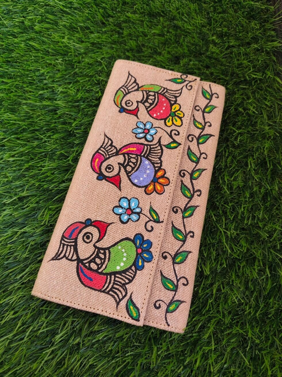 This beautifully hand-painted ladies’ clutch is a stylish way to carry your essentials. Crafted from durable jute, it features intricate Indian folk motifs brought to life through traditional hand-painted art. Perfect for adding a touch of ethnic charm to any outfit, this clutch blends elegance with cultural artistry.