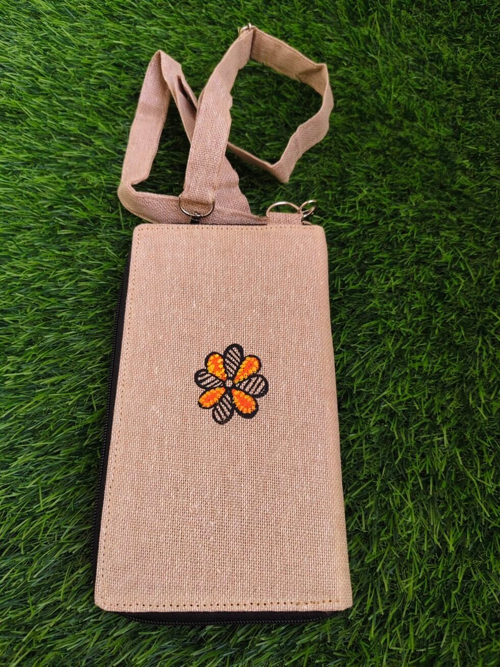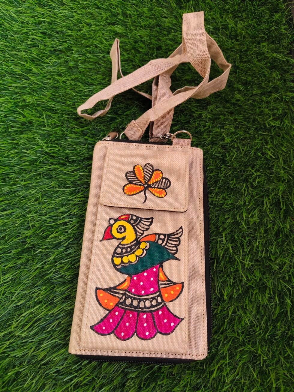 Add a touch of artistic elegance to your everyday look with this hand-painted clutch cum mobile sling, crafted on eco-friendly jute fabric. Adorned with beautiful Indian folk art motifs, this piece reflects traditional craftsmanship with a modern twist.